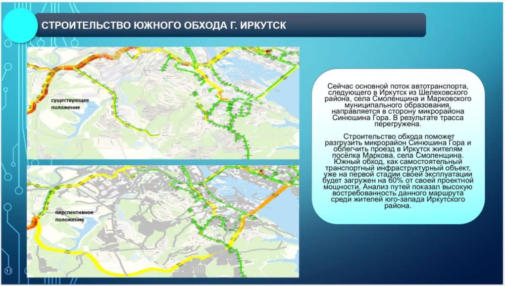 “Южный обход Иркутска – лекарство от вечных пробок на въезде в город со стороны Шелехова. Сейчас жители Шелеховского района, Смоленщины и Маркова проезжают через Синюшину гору. Трасса перегружена, а Синюшка и Иркутский район в это время задыхаются от выхлопных газов”, – пишет Евгений Стекачев.