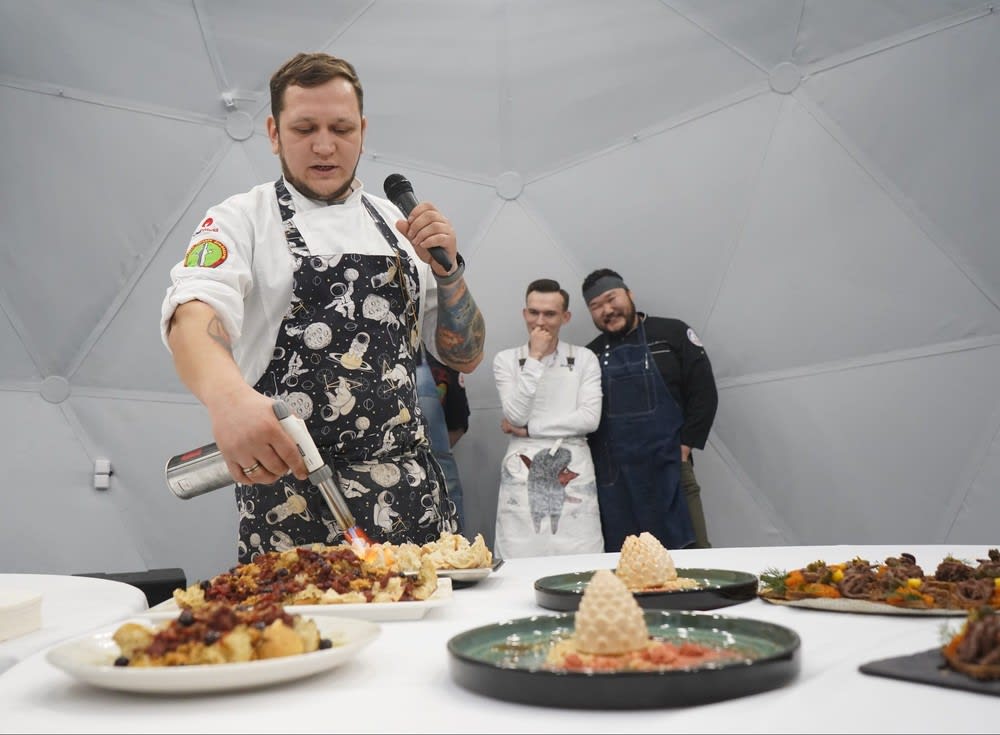 Иван Москвитин представил холодную закуску «Тартар» из ольхонской говядины, испек хлеб чиабатта и поджарил его кулинарной горелкой, устроив мини-представление.