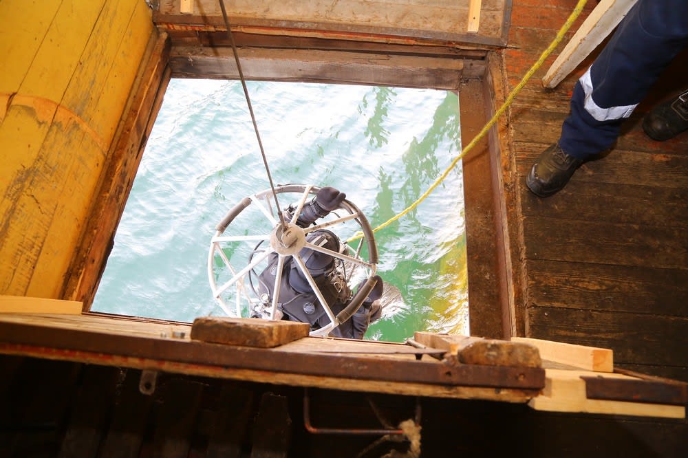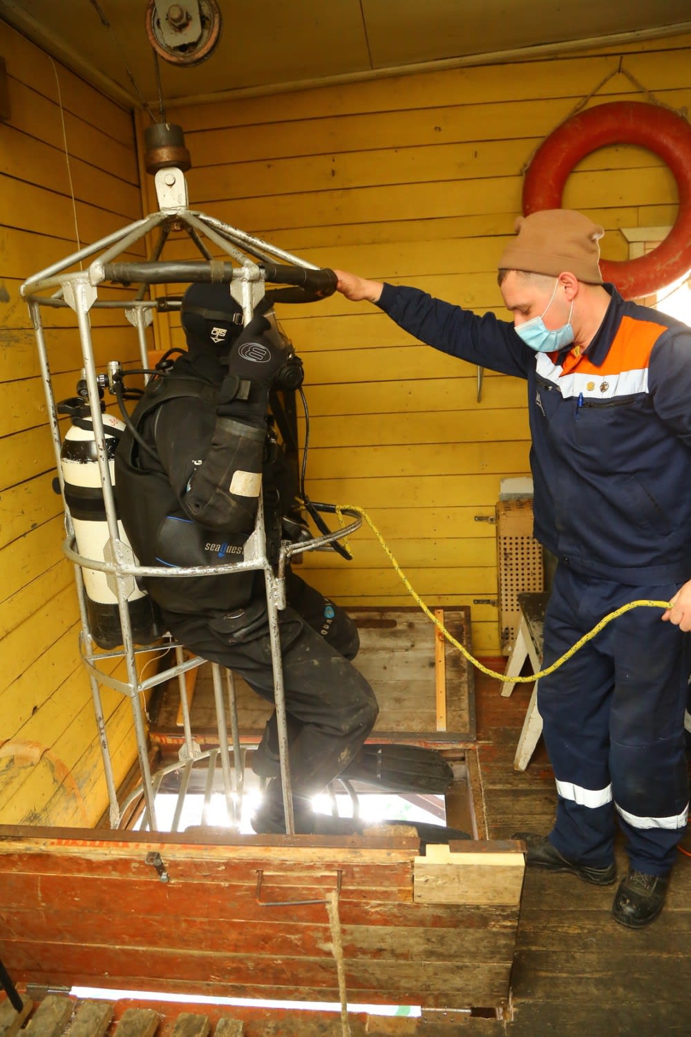 Олега страхует водолаз шестого разряда, старшина водолазной станции Сергей Шальнев. Он пришел в профессию по стопам деда Георгия Шальнева, много лет отработавшего водолазом на Братской ГЭС. Сергей, как и остальные, прошел обучение в Воронежской водолазной школе.