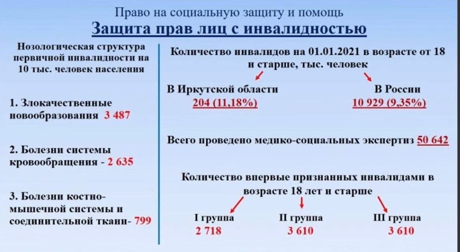 Иркутская область занимает 2 место по числу людей с инвалидностью среди регионов Сибирского федерального округа. Первое место занимает Кемеровская область. Об этом 21 апреля 2021 года доложила на сессии Законодательного собрания уполномоченный по правам человека Светлана Семенова, сообщает газета “Областная”.
