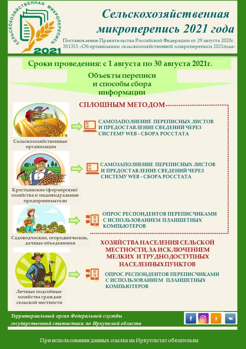 Переписчики побеседуют с председателями дачных, садоводческих и иных некоммерческих объединений граждан. Будут опрошены владельцы личных подсобных хозяйств в сельской местности. Не попадут под учет только самые мелкие деревни (менее 10 семей), а также труднодоступные населенные пункты. В Приангарье полностью выпадают из микропереписи два северных района: Катангский и Мамско-Чуйский. Хозяйства в городской местности в программу микропереписи не входят.