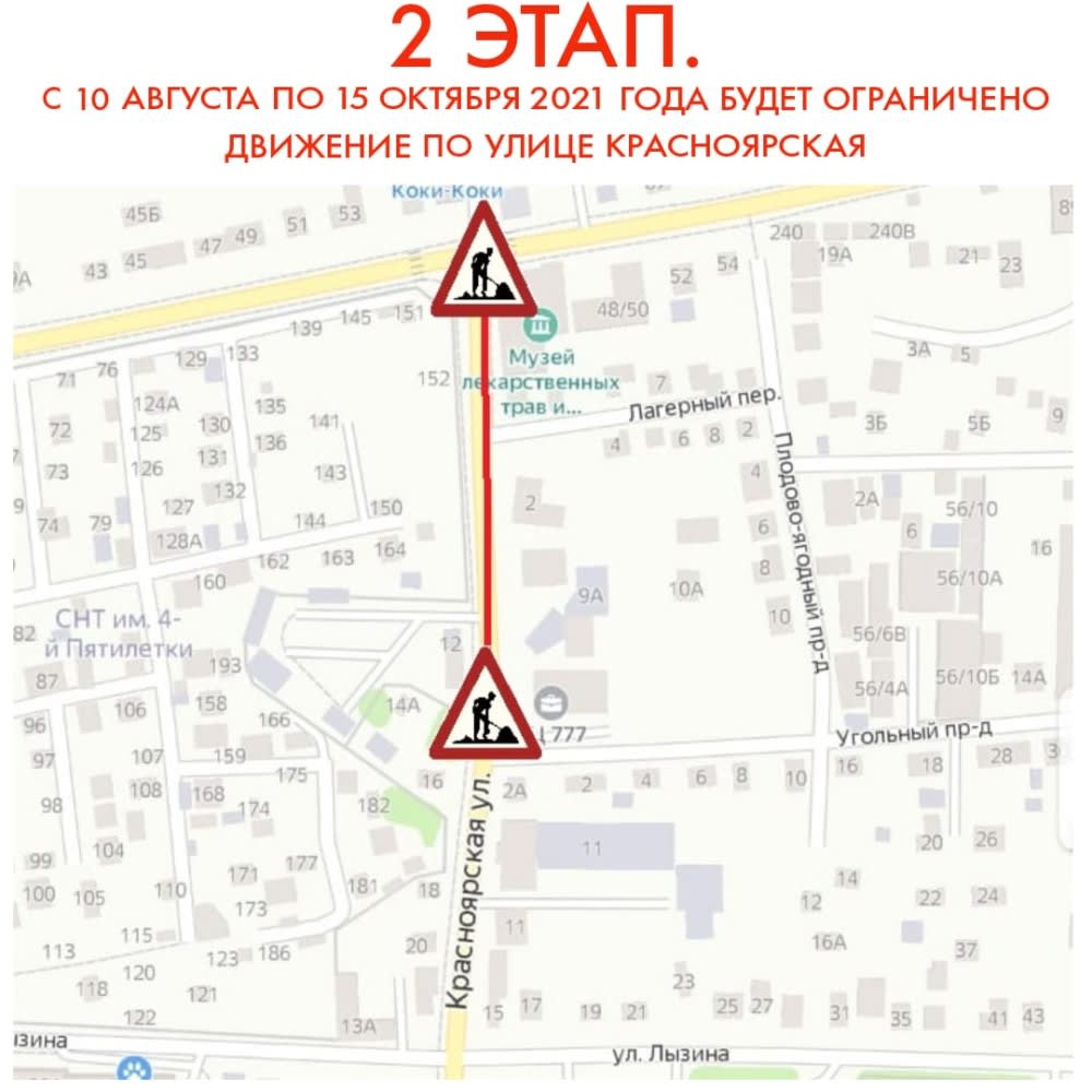 Первый этап – с 09:00 15 июля до 20:00 20 августа 2021 года будет закрыт проезд для автотранспорта по улице Красноярская – от улицы Лызина до Уголного проезда.