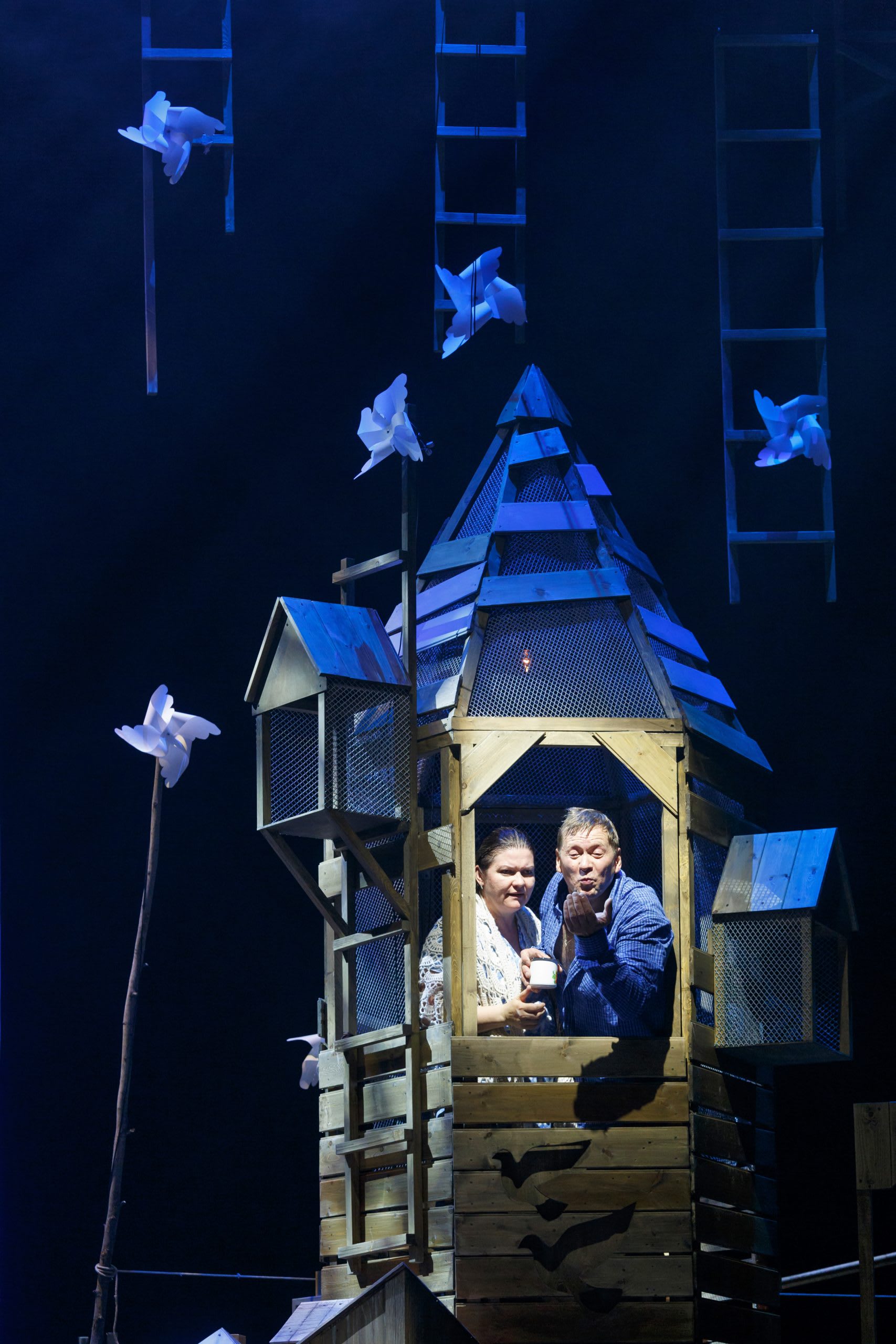 В итоге спектакль получился скорее даже лиричным, чем комедийным. Конечно, тот народный, житейский юмор, за который мы так любим это произведение, никуда не исчез. Просто с помощью театральных средств усилен более глубокий символический план пьесы. В начале постановки мы видим спроецированный на сетчатый занавес огромный советский телевизор. Потом изображение пропадает, и за этой молочной пеленой, как в тумане, проступают очертания почти сказочного домика с голубятней. Где-то в глубине сцены – силуэт юноши, который играет на флейте и словно плывет по небу. Такой эффект создают облака – на заднике сцены и виде проекции на авансцене. Эффект присутствия голубей создают белые вертушки. Пространство спектакля придумала художник Мария Шепорнева.