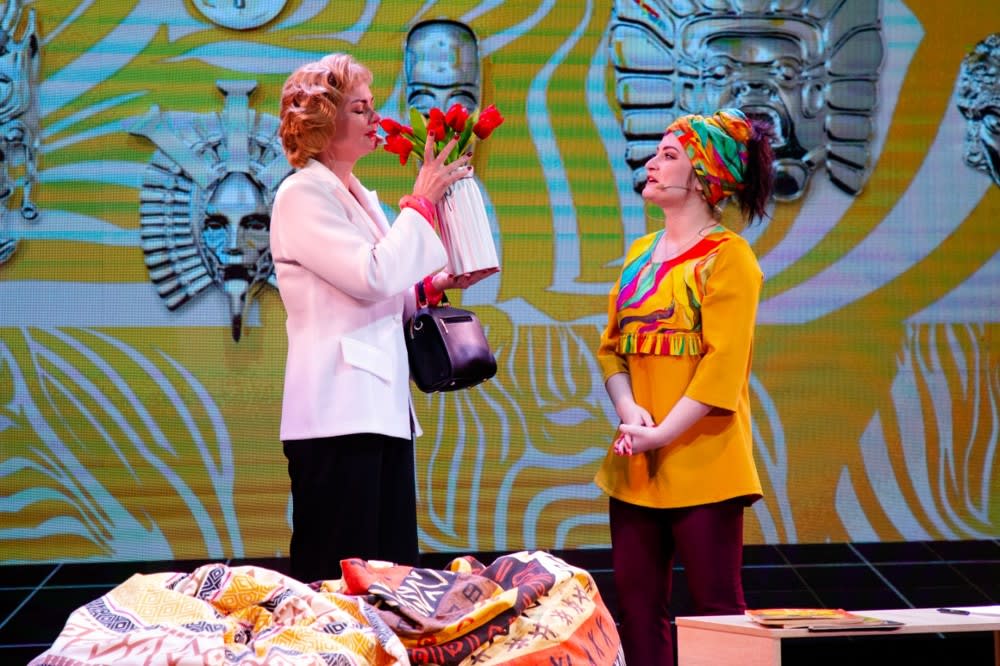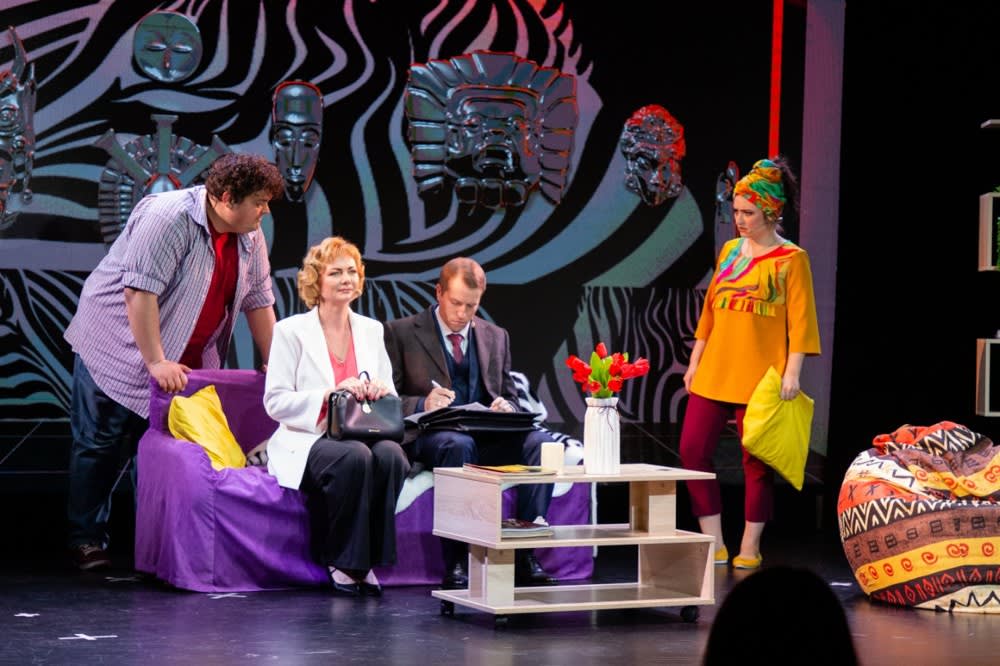 Но начинается все весьма чинно. Алан Коуэн (Егор Кириленко) и его супруга Нэнси (Анна Рыбникова) приходят в гости к Майклу Лонгстриту (Евгений Рекутный) и его жене Пэнни (Софья Сучкова). На столе стоят тюльпаны, хозяева угощают шарлоткой. Художник Анастасия Карамышева оформила гостиную в африканском стиле, ведь Пэнни Лонгстрит, писательница, специалист по межэтническим конфликтам, увлекается Африкой. Фиолетовый, оранжевый, звериный принт, яркие орнаменты, маски на стенах и одежда хозяйки дома как бы сразу намекают на то, что разговор между парами будет жаркий. Впрочем, ее супруг Майкл, торговый агент, выглядит более сдержанно, хотя и демократично. Прямая противоположность хозяевам – Коуэны. Алан – адвокат, а его жена, домохозяйка, одеты в подчеркнуто классическом стиле.