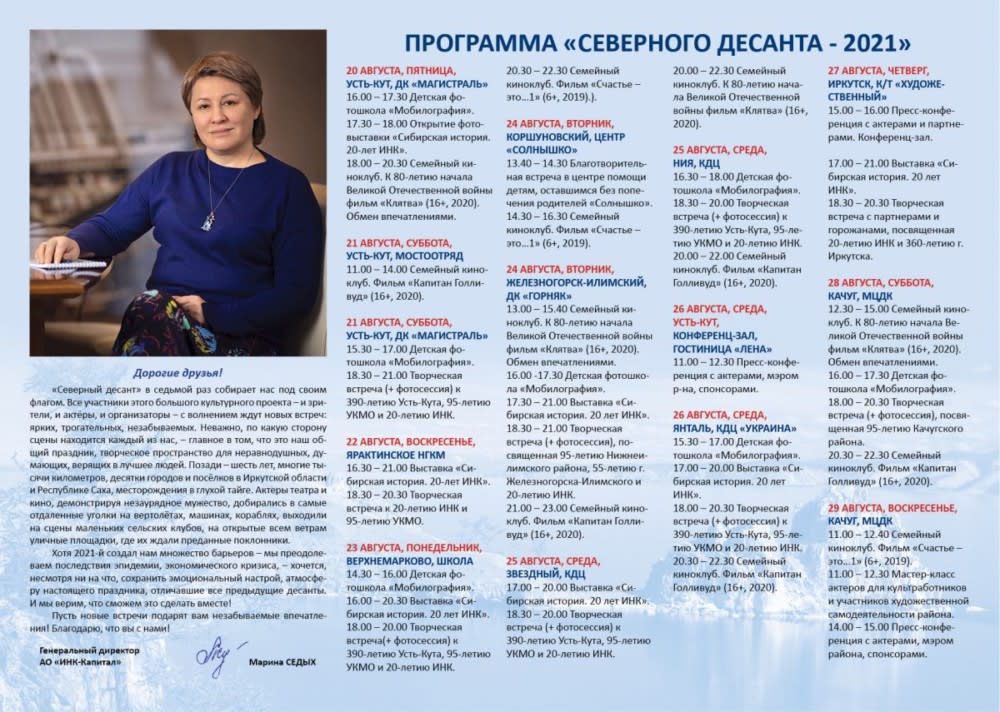 “Северный десант-2021” посвящен Году Байкала, 20-летию Иркутской нефтяной компании, 55-летию Железногорска-Илимского, 95-летию Усть-Кутского, Нижнеилимского и Качугского районов, 360-летию Иркутска, 390-летию Усть-Кута.
