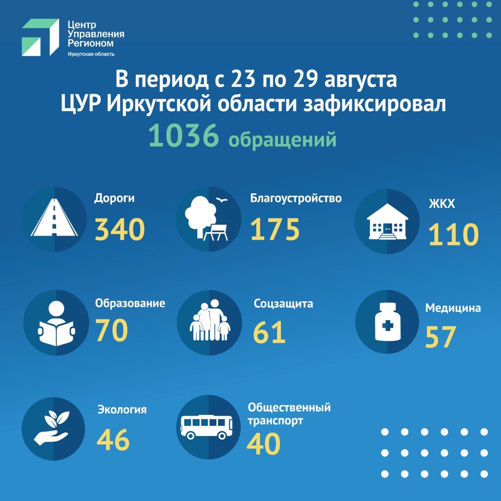 С 23 по 29 августа 2021 года зафиксировано 1036 обращений от жителей Иркутской области. Больше всего волнуют вопросы об отключении воды, ремонте дорог. Об этом 30 августа 2021 года сообщает Центр управления регионом.