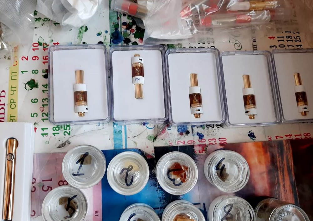 Экспертиза установила, что растительные вещества содержат марихуану и гашиш. В составе жидкостей обнаружили синтетический каннабиноид ТГК (тетрагидроканнабинол). Общий вес наркотических веществ составил около 150 грамм.