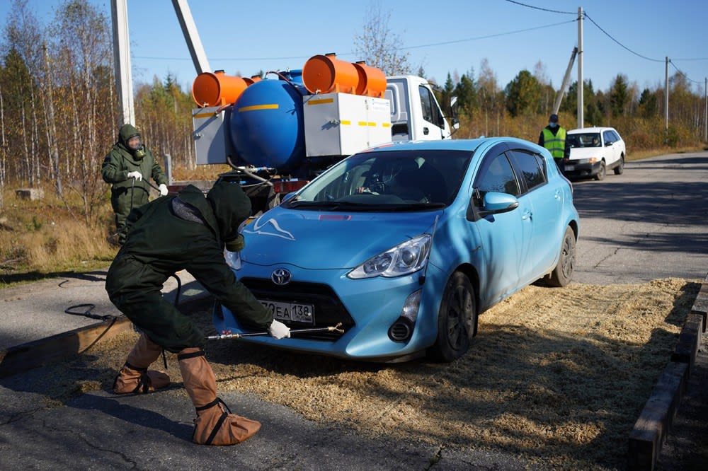 Сразу после объявления учебной ЧС на въезде в Новоснежную с федеральной трассы и на дороге, ведущей к озеру Байкал, появились круглосуточные контрольно-пропускные пункты. С двух сторон пешеходного моста, соединяющего регионы, стоят ветеринарные посты. Здесь дежурные обрабатывают подошвы проходящих людей, велосипедные и мопедные камеры специальным дезраствором.
