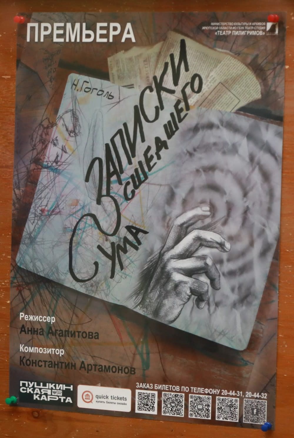 На сцене трое – Защитник, Карьерист, Романтик. Причем они – не разные персонажи, а ипостаси одного героя. Мелкий чиновник Аксентий Иванович Поприщин из повести «Записки сумасшедшего» Николая Гоголя в спектакле иркутского «Театра пилигримов» предстает в четырех лицах. Три из них – его внутренние части, а четвертый – он, в своем реальном воплощении. Еще одним полноправным героем можно назвать музыку, которую художественный руководитель театра, композитор Константин Артамонов тоже разделил на четыре составляющие. По его словам, в этом спектакле впервые на иркутской сцене был применен квадрозвук. Премьера состоялась в Доме актера.