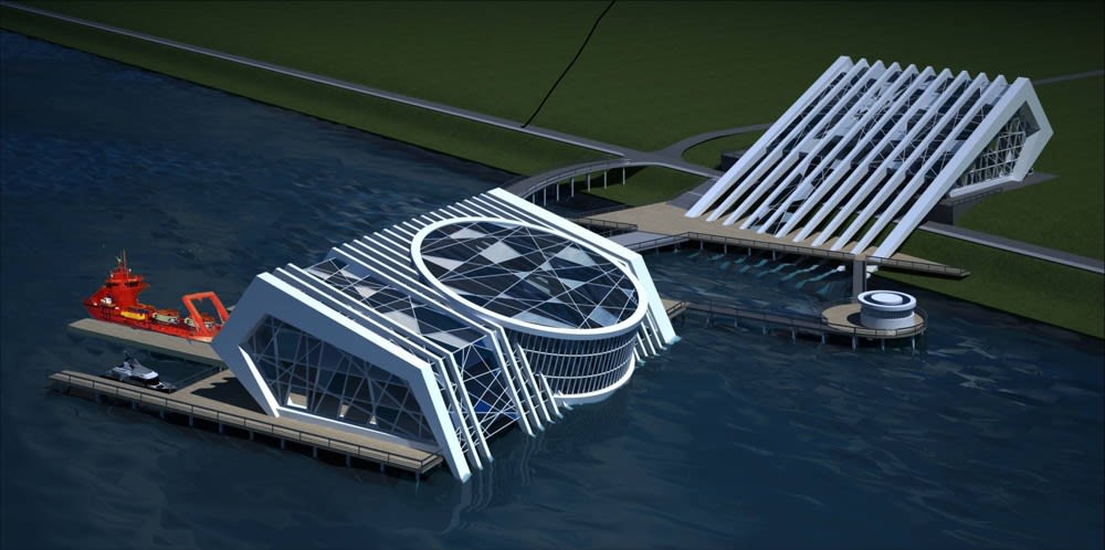 Центром притяжения комплекса, построенного на четырехметровом участке шельфа напротив существующего здания, должен стать подводный зал. Представьте, посетители смогут воочию наблюдать его подводный мир, спустившись на нулевой этаж здания.