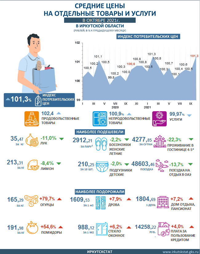 В октябре по сравнению с предыдущим месяцем индекс потребительских цен составил 101,3%, в том числе на продовольственные товары – 102,4%, непродовольственные товары – 100,9%, услуги – 100,0%.
