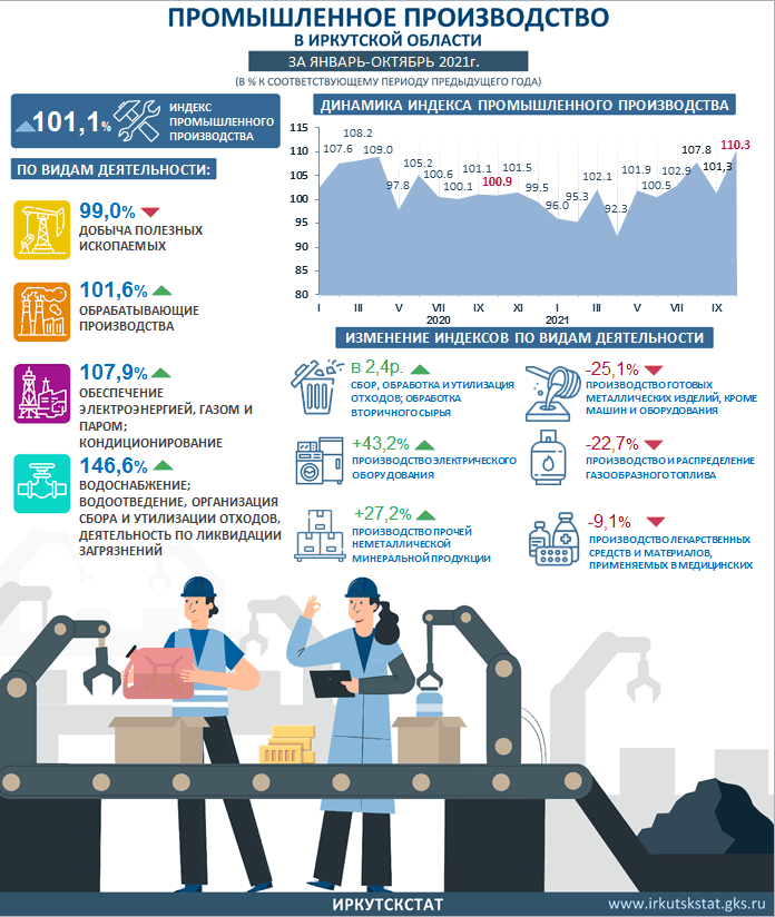Индекс промышленного производства в Иркутской области в январе-октябре 2021 года составил 101%. Об этом 2 декабря сообщает пресс-служба Иркутскстата.
