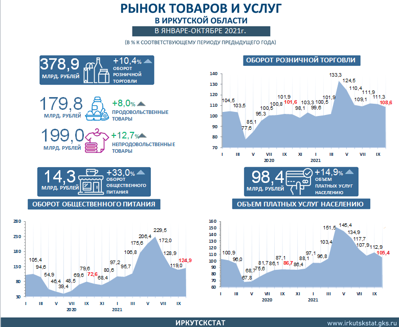Объем работ в строительстве оценивается в 221,5 млрд рублей, что в 2,2 раза больше, чем в предыдущем году. Оборот розничной торговли за 10 месяцев составил 378,9 млрд рублей, это на 10,4% больше, чем годом ранее, в сопоставимых ценах. Оборот общественного питания – 14,3 млрд. рублей (увеличен на 33%).