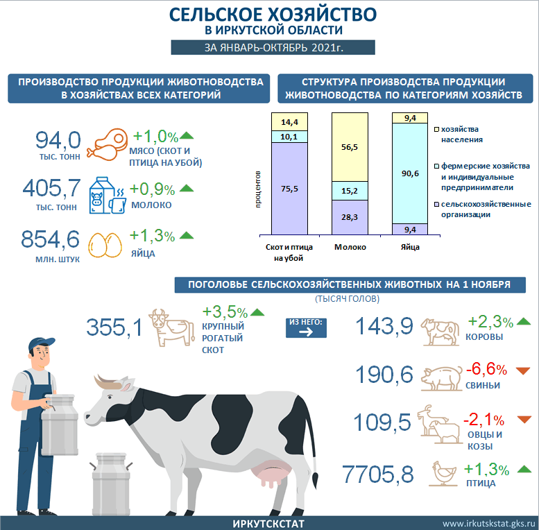 На 1 ноября по сравнению с аналогичным периодом предыдущего года увеличилось поголовье крупного рогатого скота – на 3,5% (из него коров – на 2,3%), птицы – на 1,3%. Свиней стало меньше на 6,6%, овец и коз – на 2,1%. Произведено скота и птицы на убой (в живом весе) на 1% больше, молока – на 0,9, яиц – на 1,3%.