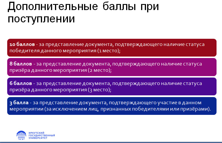 Итоги конкурса подведут до 25 апреля. Участники, которые займут первые места в секциях, получат диплом победителя и 10 дополнительных баллов, которые они смогут использовать при поступлении в ИГУ. Напомним, что это максимальное количество дополнительных баллов, которое можно получить за индивидуальные достижения. Ребята, которым присудят вторые места, получат по восемь баллов. За третье место участники получат шесть баллов. Кроме того, все те, чьи работы будут допущены к участию в конкурсе и пройдут защиту, получат по три дополнительных балла.