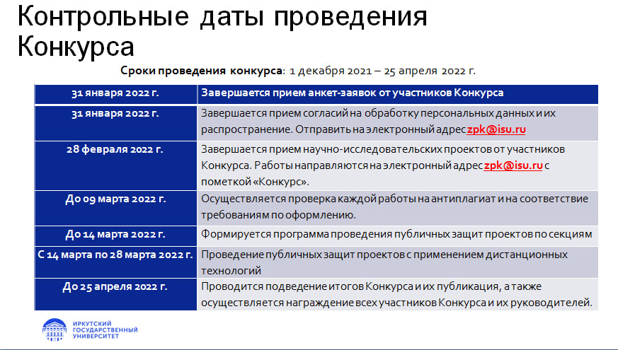 Прием проектов завершится 28 февраля 2022 года. Работы нужно будет отправить на электронный адрес zpk@isu.ru с пометкой «Конкурс». До 9 марта они будут проверены на антиплагиат и соответствие требованиям по оформлению.