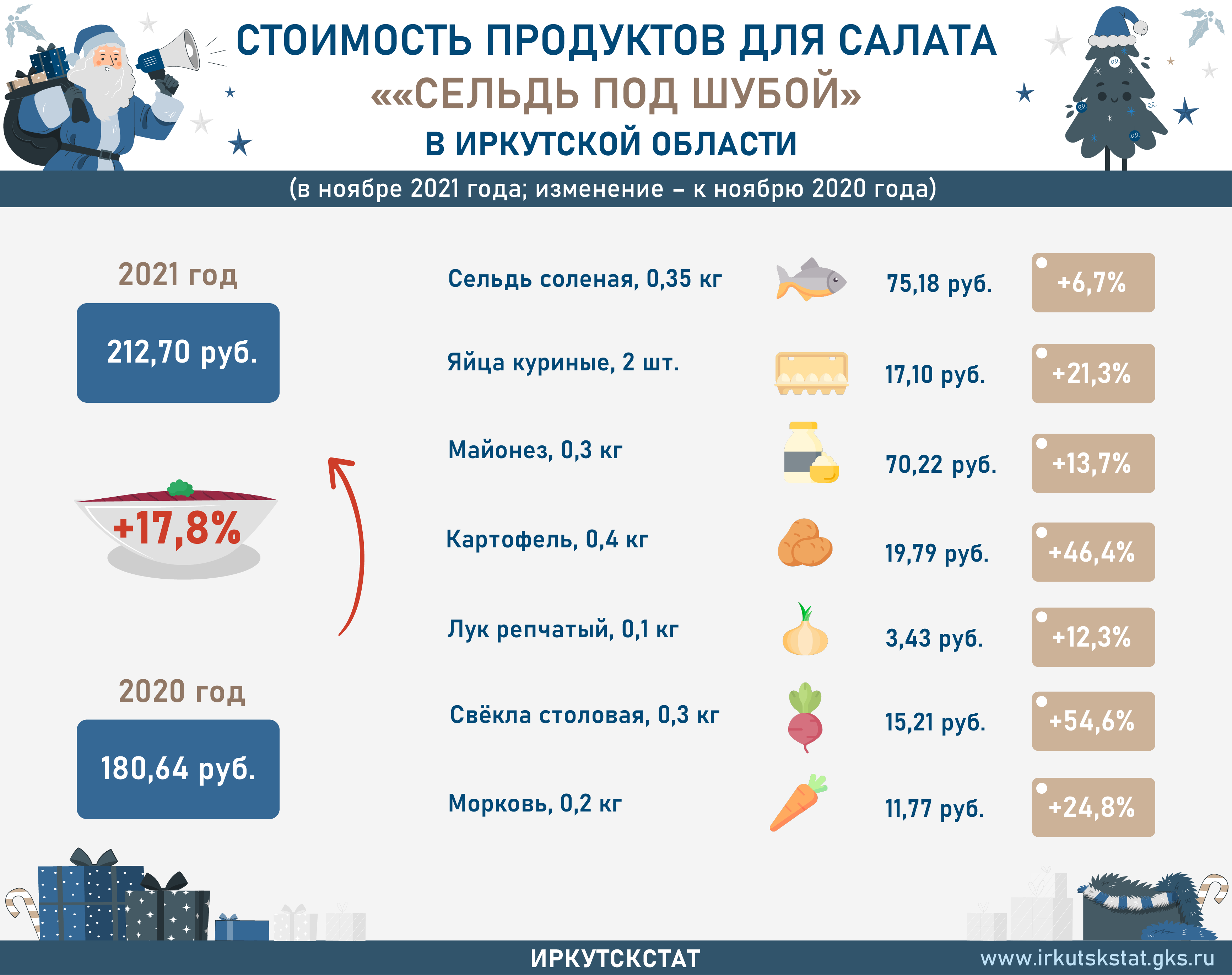 Увеличение стоимости данных блюд связано с прибавкой в цене всех компонентов. Значительнее всего подорожали свекла и картофель – в 1,5 раза по сравнению с ноябрём предыдущего года. Морковь – на 25%, консервы рыбные – на 22%, яйца – на 21%, майонез – на 14%, репчатый лук – на 12%, маринованные овощи и варёная колбаса – на 9%, сельдь соленая – на 7%.
