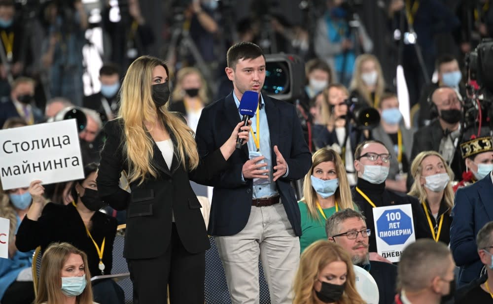 За полчаса до начала встречи телевизионщики успевают «прямиться», кто-то надиктовывает в редакцию первые новости, а то и стримить в «ТикТок». «Звезды» журналистики не упускают случая дать свой собственный брифинг: вот камеры окружили Ксению Собчак, неподалеку что-то кричит, видимо, по привычке, Дмитрий Губерниев. Среди мэтров журналистки видно Александра Гамова из «Комсомолки», Андрея Колесникова из «Коммерсанта», Александра Юнашева из Life, Сергея Брилева («Россия 1») и даже Сергея Шнурова, с недавних пор генерального продюсера телеканала RTVI.
