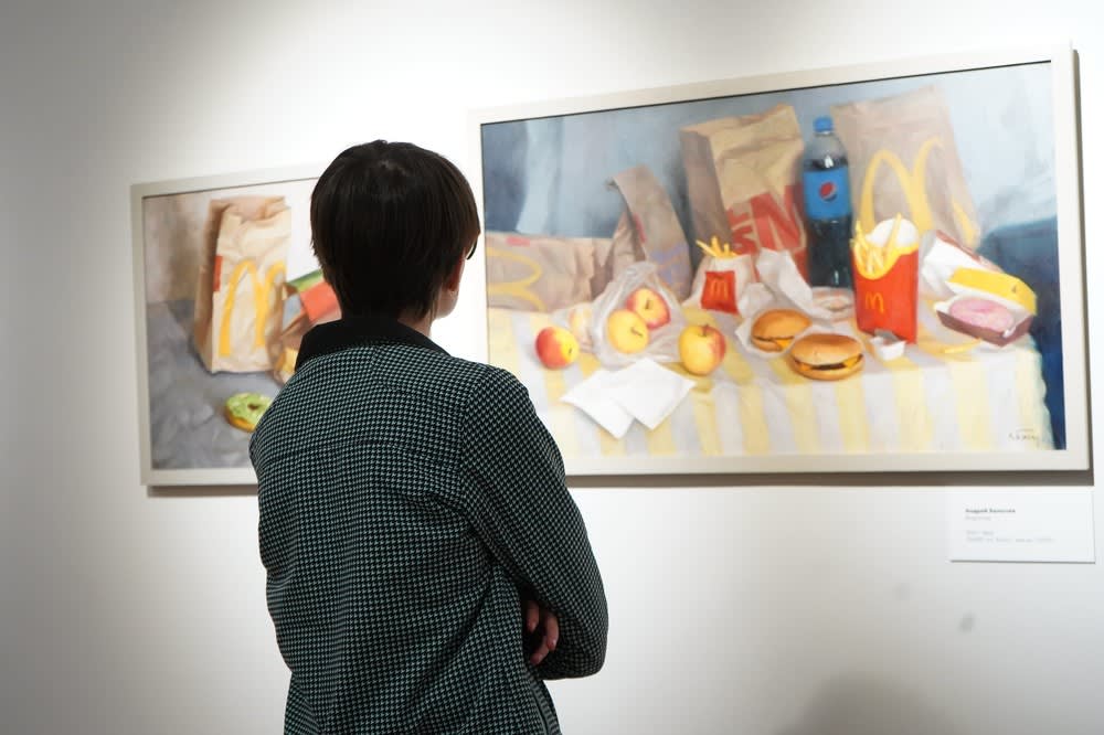 Помимо традиционной домашней еды на экспозиционном столе яств есть фастфуд с газировкой. Автор натюрморта с современной едой – художник из Воронежа Андрей Былычев. Интересно, что он использовал приемы классической живописи.