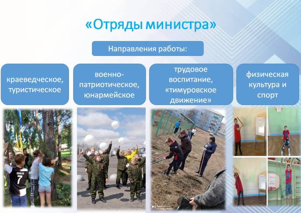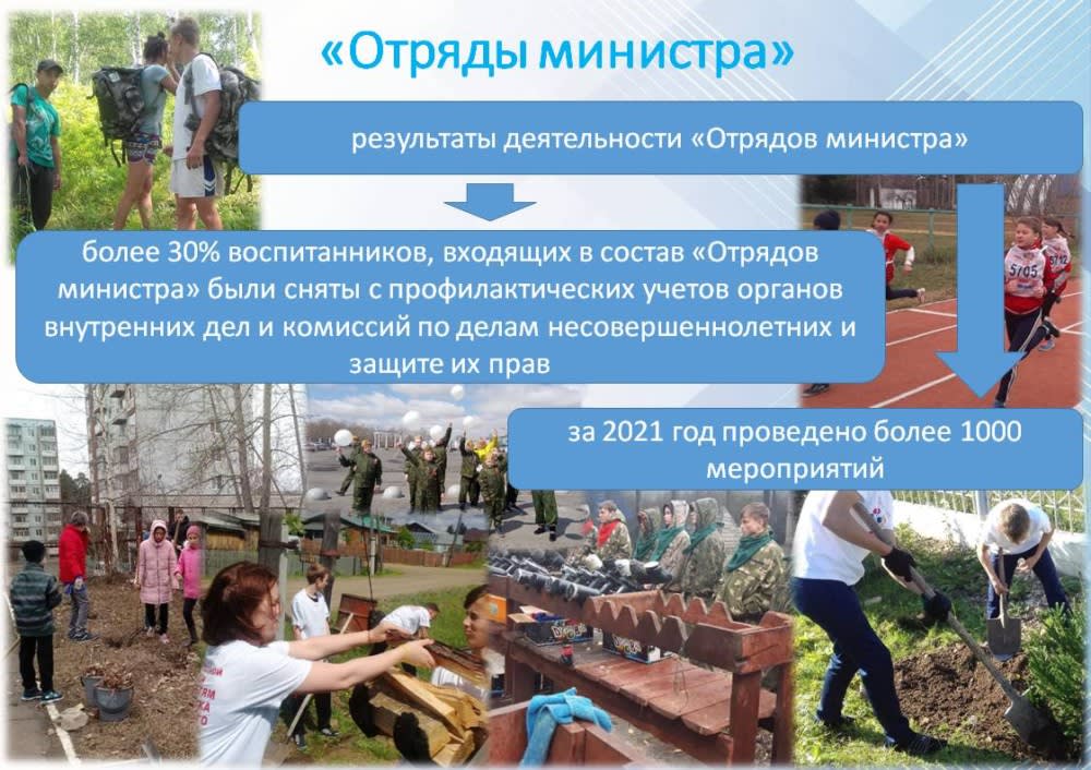 «Отряды министра» впервые появились в социальных учреждениях региона в 2018-2019 годы. Их задачей стало вовлечение несовершеннолетних, находящихся в конфликте с законом и в трудной жизненной ситуации, в социально-значимую деятельность. Сегодня отряды действуют на базе 30 учреждений. Они осуществляют работу в краеведческом, туристическом, военно-патриотическом, трудовом и спортивном направлениях.