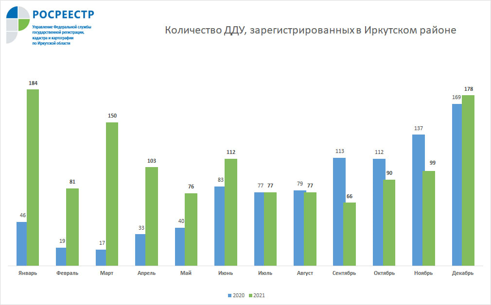 Значительно вырос интерес к жилью, строящемуся в Иркутском районе, там в декабре было зарегистрировано 178 ДДУ. Это на 80% больше, чем в ноябре. Тогда в Иркутском районе было оформлено 99 договоров долевого участия.