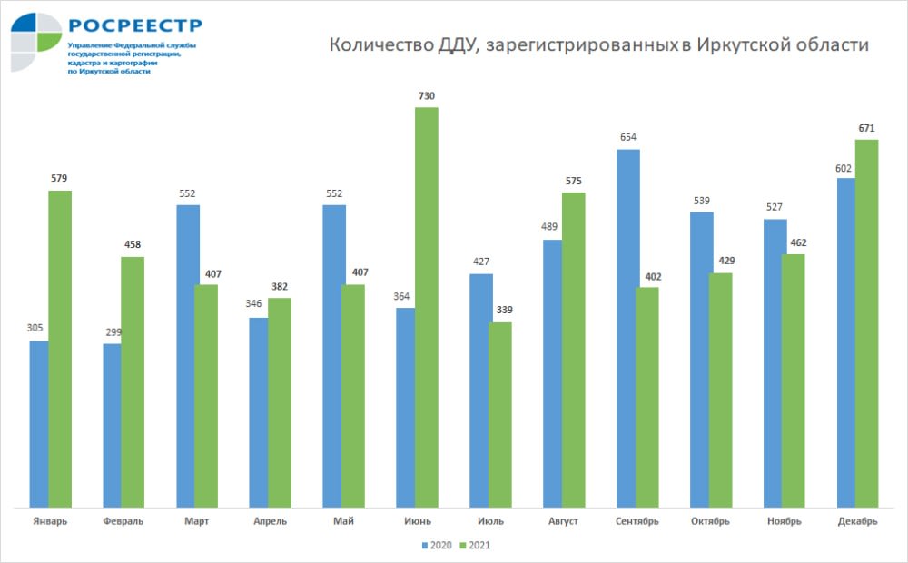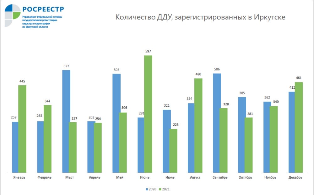 В декабре 2021 года Росреестр Иркутской области зарегистрировал 671 договор долевого участия в строительстве. По сравнению с ноябрем года спрос на жилье в новостройках вырос на 45%, по отношению к декабрю 2020 года рост составил 11%. Об этом 19 января 2022 года сообщает пресс-служба ведомства.