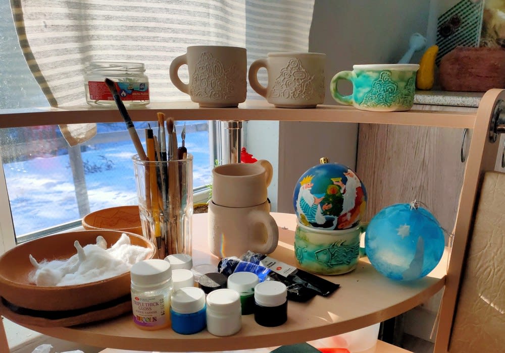 Ее рабочая «студия» в теплое время года – веранда, в холодное – стол на кухне. Инструментарий обширный: от формочек до гончарного круга. А вот краски, глазури и большая часть материала, из которого может получиться кружка или целый шахматный набор, доставляются на остров с «большой земли».