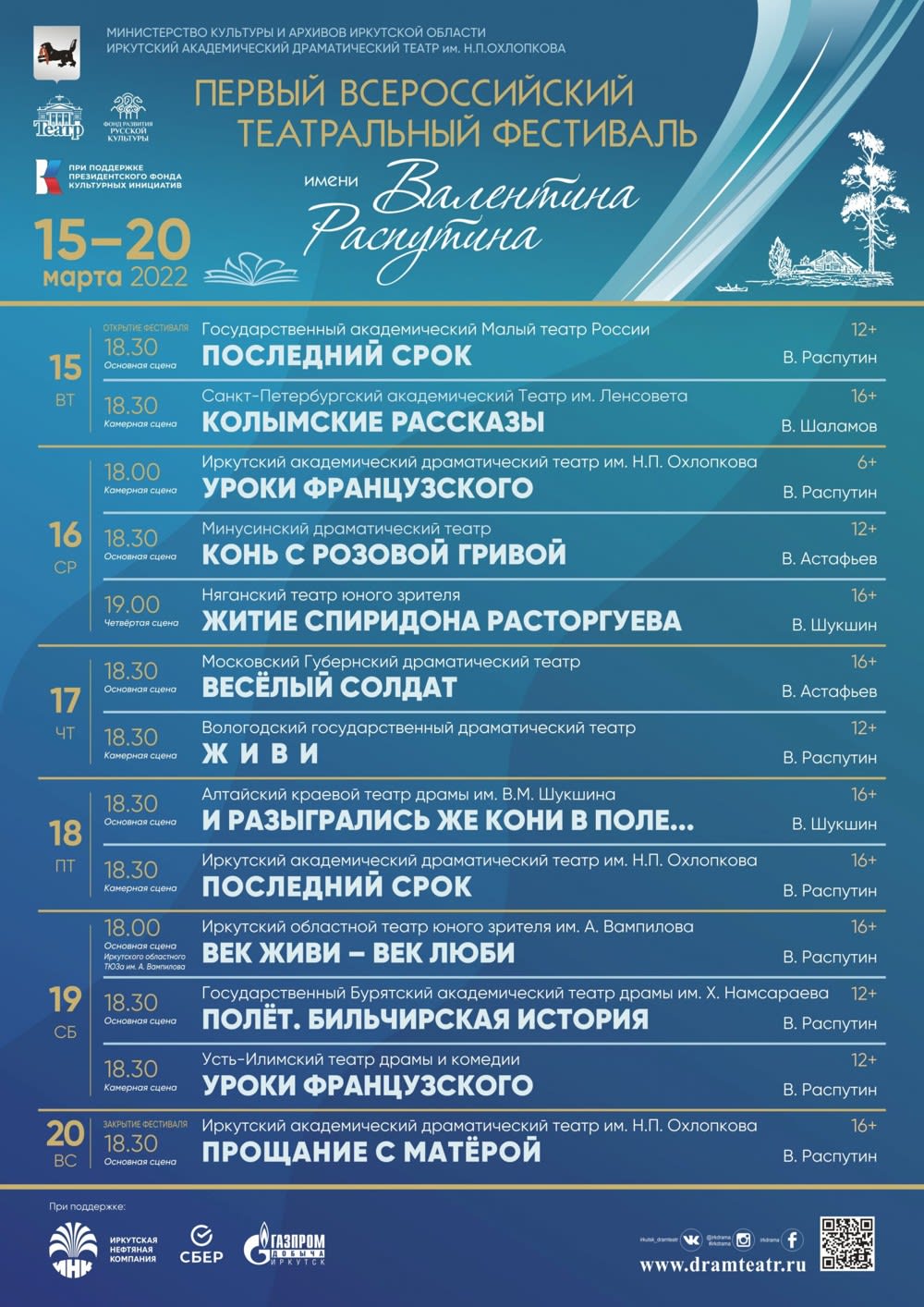 Наследие Валентина Распутина занимает особое место в регионе. Ведь для многих писатель с мировым именем еще и земляк, который ходил по тем же улицам, поднимал проблемы экологии Байкала и исчезающей деревни. Поэтому именно в Иркутске должен был появиться театральный фестиваль им. Валентина Распутина. И неслучайно с инициативой его проведения к 85-летию писателя выступил Иркутский академический драматический театр им. Н.П. Охлопкова, визитной карточкой которого уже многие годы является спектакль «Последний срок». Напомним, что этот шедевр театрального искусства был снят телеканалом «Культура» в числе лучших постановок страны.