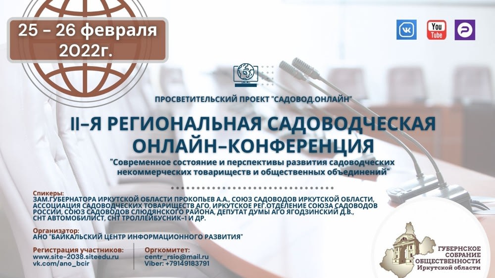 В Иркутске 25 и 26 февраля 2022 года по проекту «САДОВОД.ОНЛАЙН» пройдет II-я региональная садоводческая онлайн-конференция. Об этом сообщают организаторы.