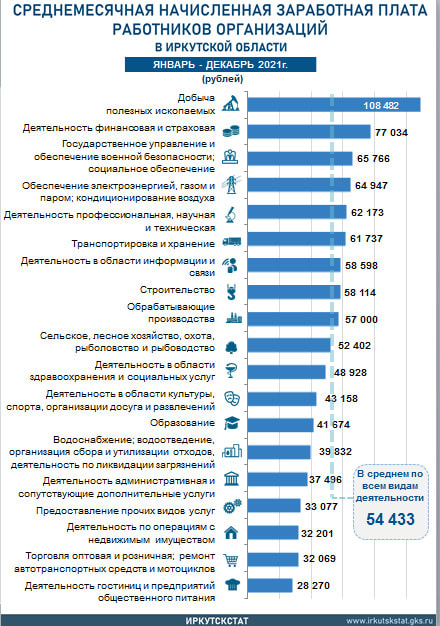 В целом по экономике Иркутской области средняя номинальная начисленная зарплата работников организаций (без учета наёмных работников у индивидуальных предпринимателей, самозанятых) за декабрь 2021 года составила 69211 рублей, а за весь прошлый год – 54433 рубля в месяц. Об этом 2 марта 2022 года сообщает Иркутскстат.