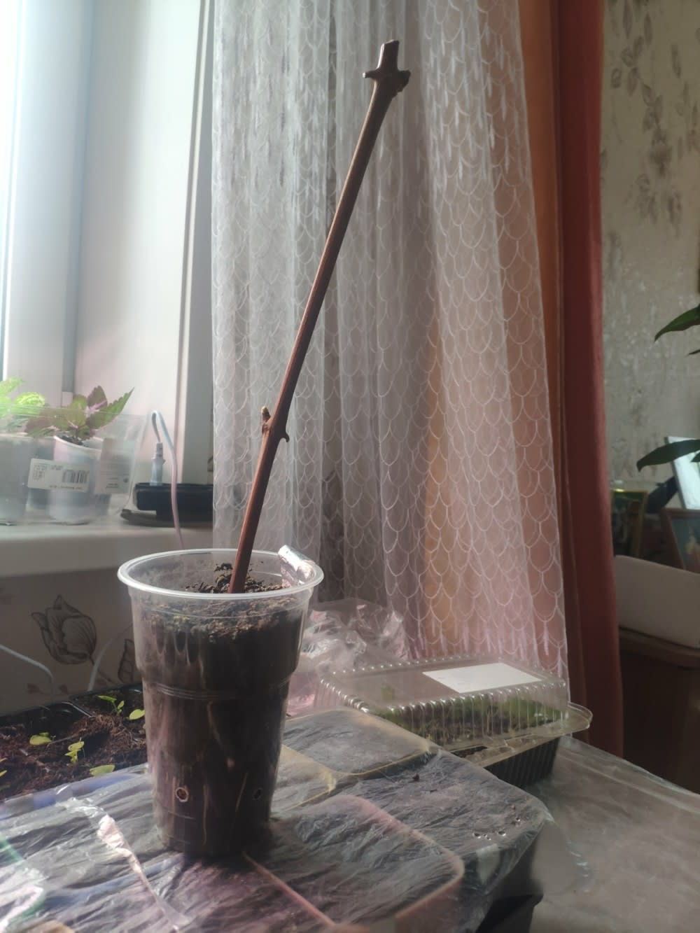 Нижнюю часть черенка я заворачиваю как куколку, кладу прутик на подоконник так, чтобы завернутая часть свисала поближе к батарее. Это называется кильчевание – предпосадочная подготовка к укоренению черенков при размножении винограда. Кильчевание делается для образования пяточных корней и тормозит пробуждение и распускание глазков в верхней части. Это достигается путем помещения нижних концов черенков в условия, благоприятные для образования корней, а верхних, наоборот, в условия, задерживающие распускание почек. Обязательно проверяйте ваш саженец, недопустимо, чтобы он был сухой.