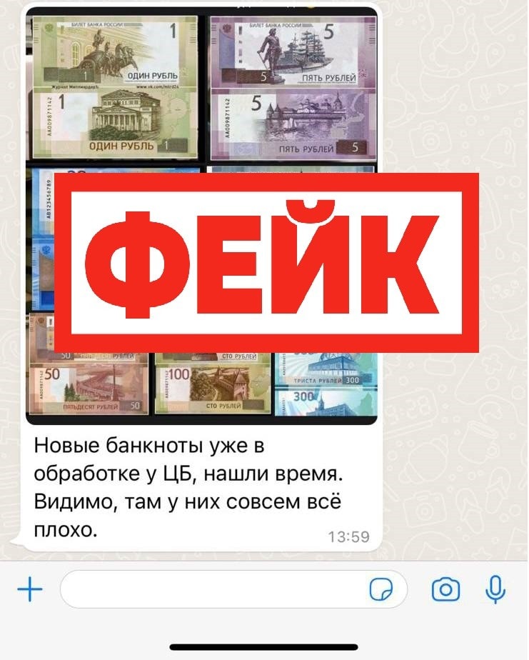 Информация о том, что в России готовятся выпустить в обращение новые купюры номиналом в 10, 20, 50, 300 рублей и даже в 1 рубль, является не достоверной. Фотографии новых купюр рассылают другу другу пользователи мессенджеров и социальных сетей. Об этом 12 марта 2022 года пишет портал войнасфейками.рф.
