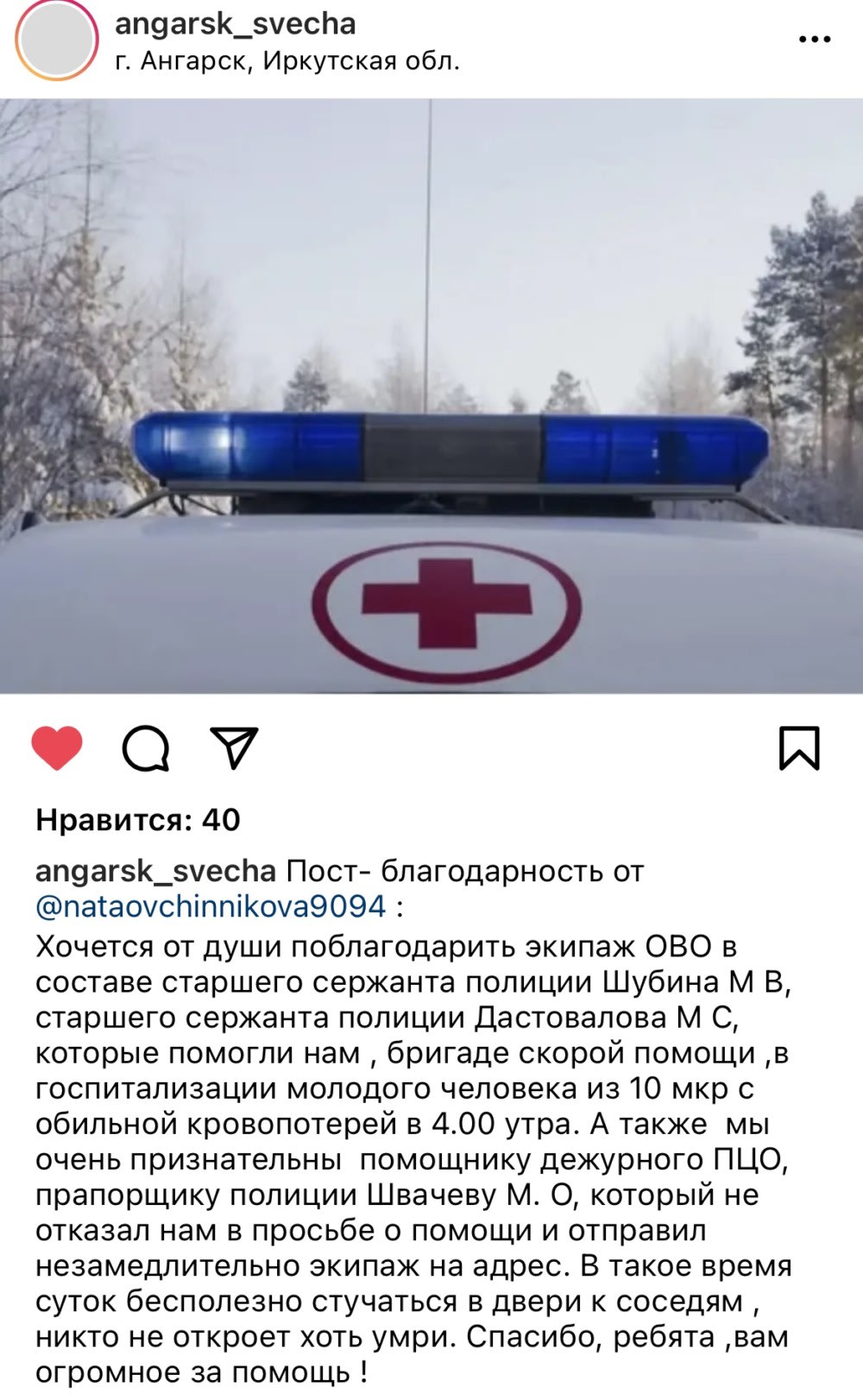 «Хочется от души поблагодарить экипаж ОВО в составе старших сержантов полиции Михаила Шубина и Михаила Достовалова, которые помогли нам, бригаде скорой помощи, в госпитализации молодого человека с обильной кровопотерей», – говорится в сообщении, опубликованном врачами в одной из социальных сетей.
