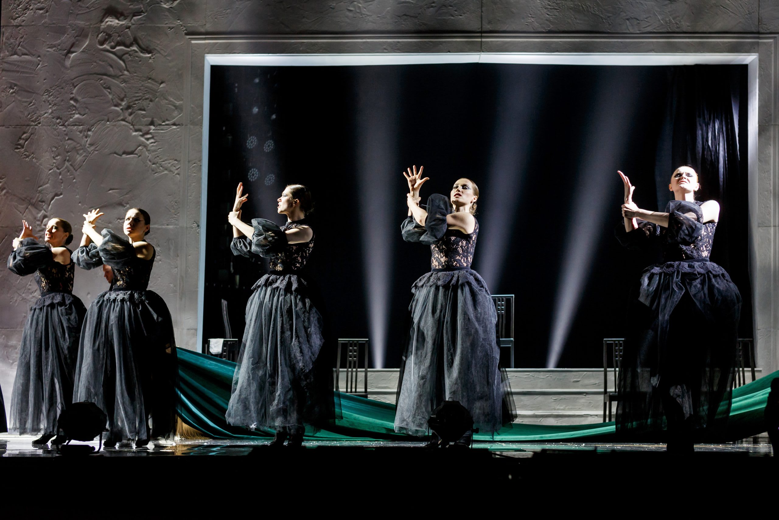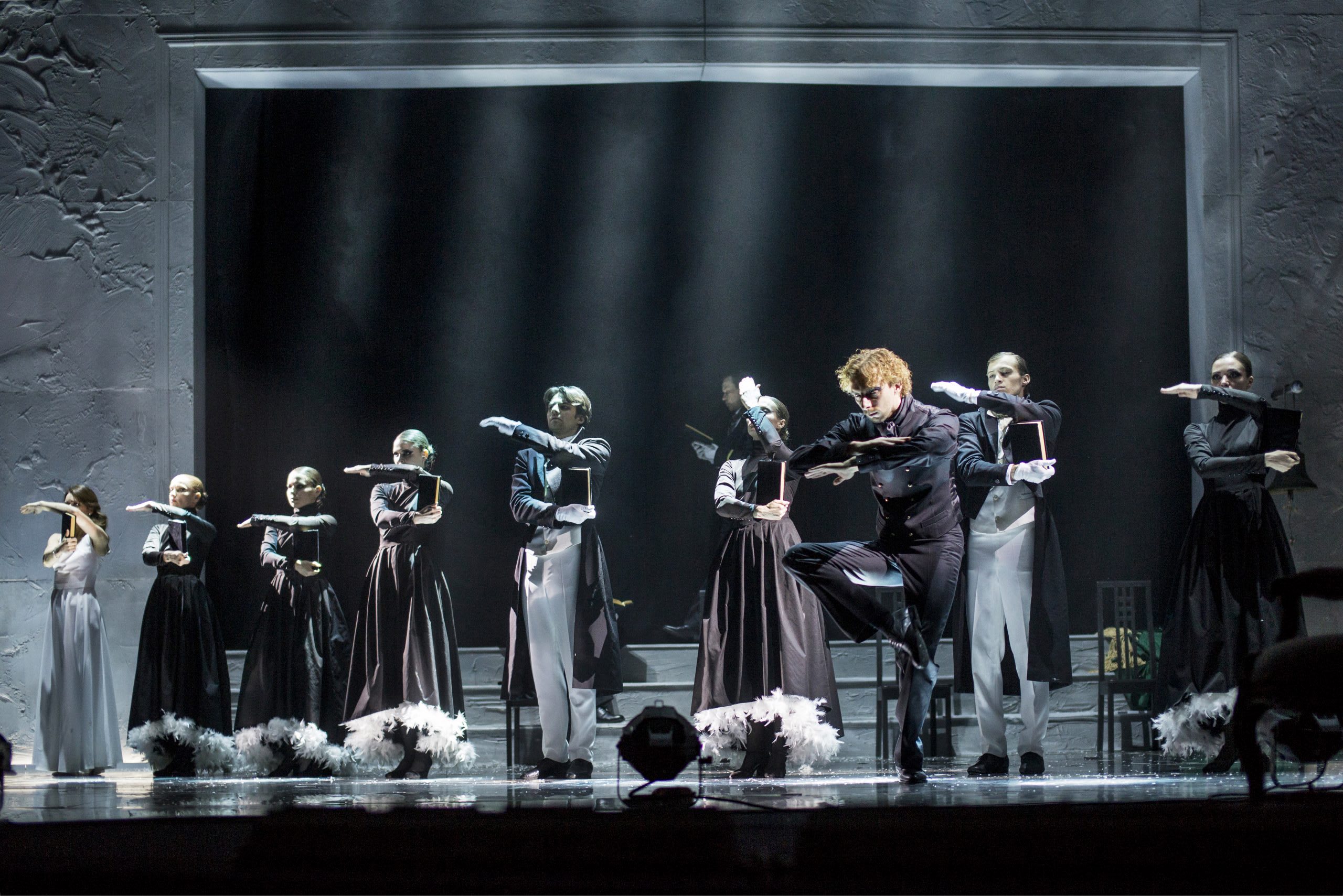 Танец, элементы театра теней, взаимодействие с ростовыми тряпичными куклами и зеленым сукном занавеса одного из порталов – все это создает особый мир спектакля, где порок скрывается под маской приличия. Не случайно почти все герои постановки одеты в черное. И только Нина (Алена Бочкарева), как мотылек, летящий на пламя, предстает перед зрителями в белом платье.