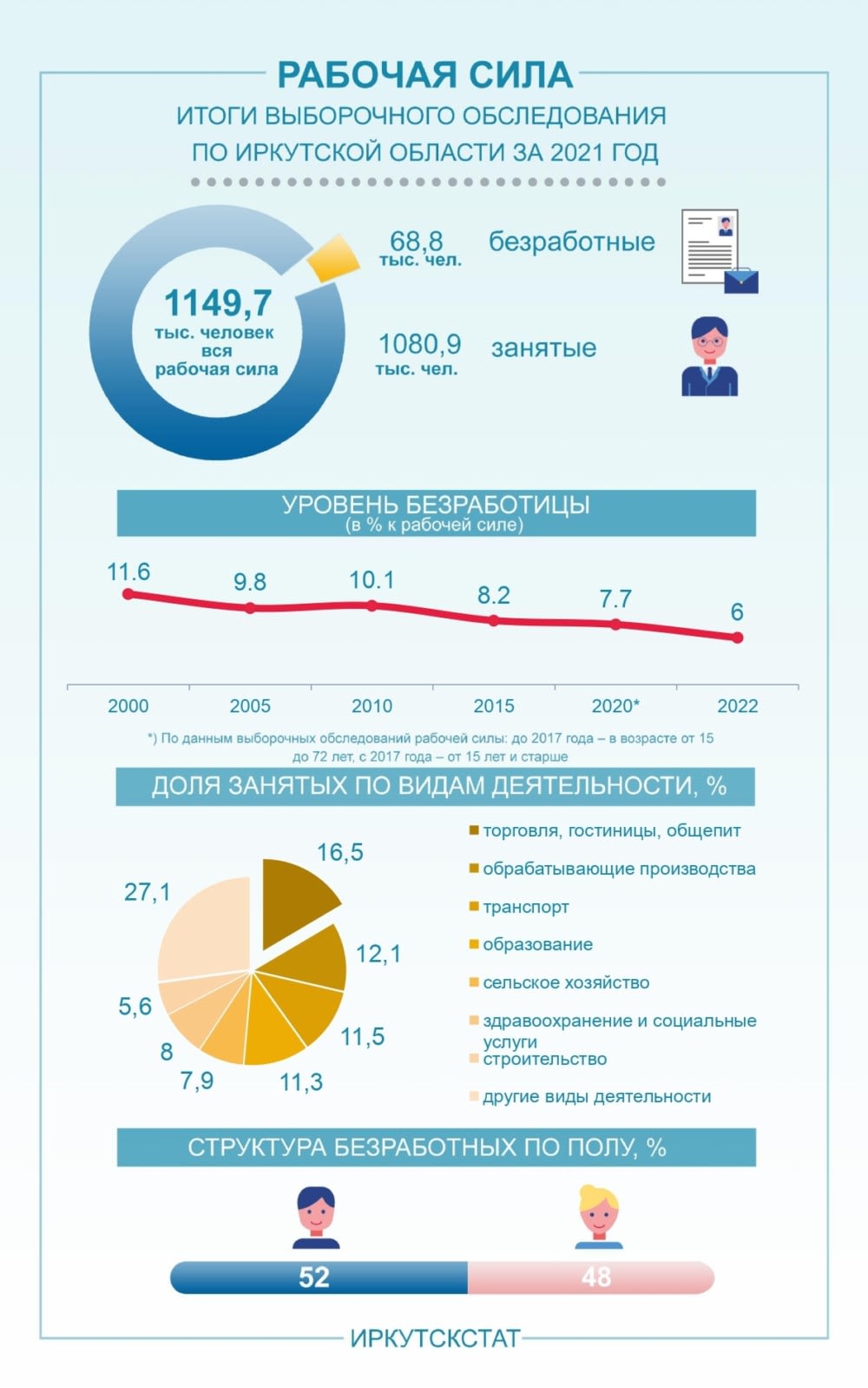В Иркутской области по итогам 2021 года численность рабочей силы (в возрасте 15 лет и старше) составила 1 млн 149,7 тыс. человек. Из них 1 млн 80,9 тыс. человек классифицировались как занятые экономической деятельностью и 68,8 тыс. человек – безработные (т.е. не имели работы или доходного занятия, искали работу и были готовы приступить к ней в обследуемую неделю). Об этом сообщает Иркутскстат.