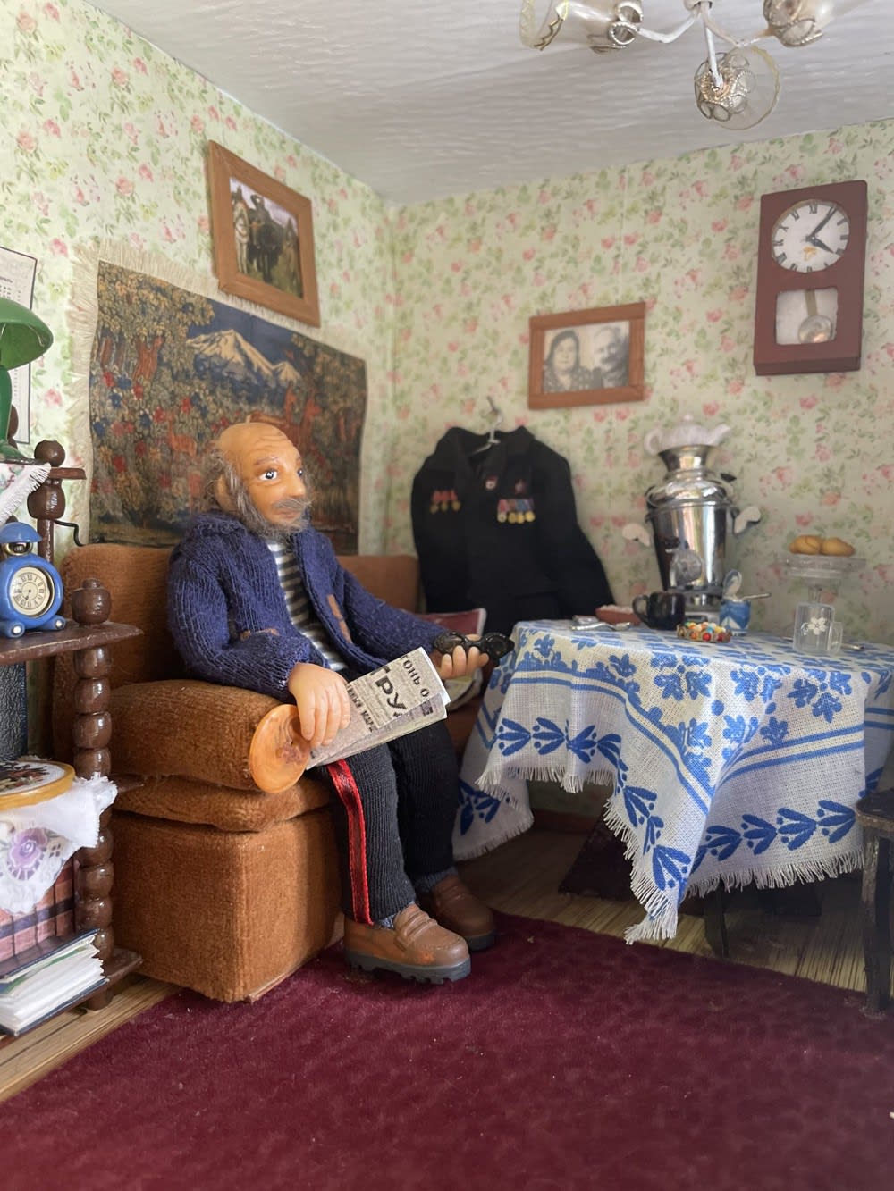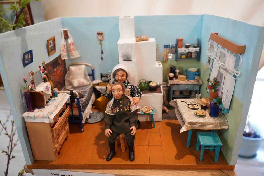 На вставке можно увидеть две ее работы, выполненные в технике румбокс, это небольшие декорированные под комнату коробки с бытовыми предметами и куклами-героями. Одна из миниатюр – дом ее родственников, где передана атмосфера подготовки к 9 Мая. Бабушка готовит дедушку к параду. Он сидит на стуле, она его подстригает перед тем, как отправить на торжественное мероприятие, дедушка – в парадной форме, грудь в медалях и орденах.