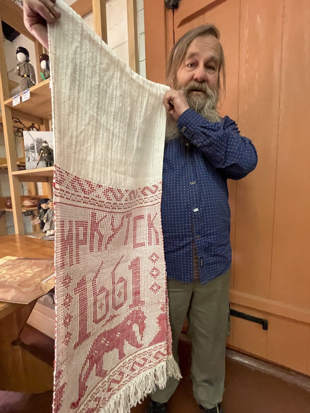 О своем необычном произведении на выставке рассказал Владимир Пичугин, пенсионер из поселка Большой Луг Шелеховского района. Он собственноручно смастерил старинные деревянные кросны и занимается ткачеством.