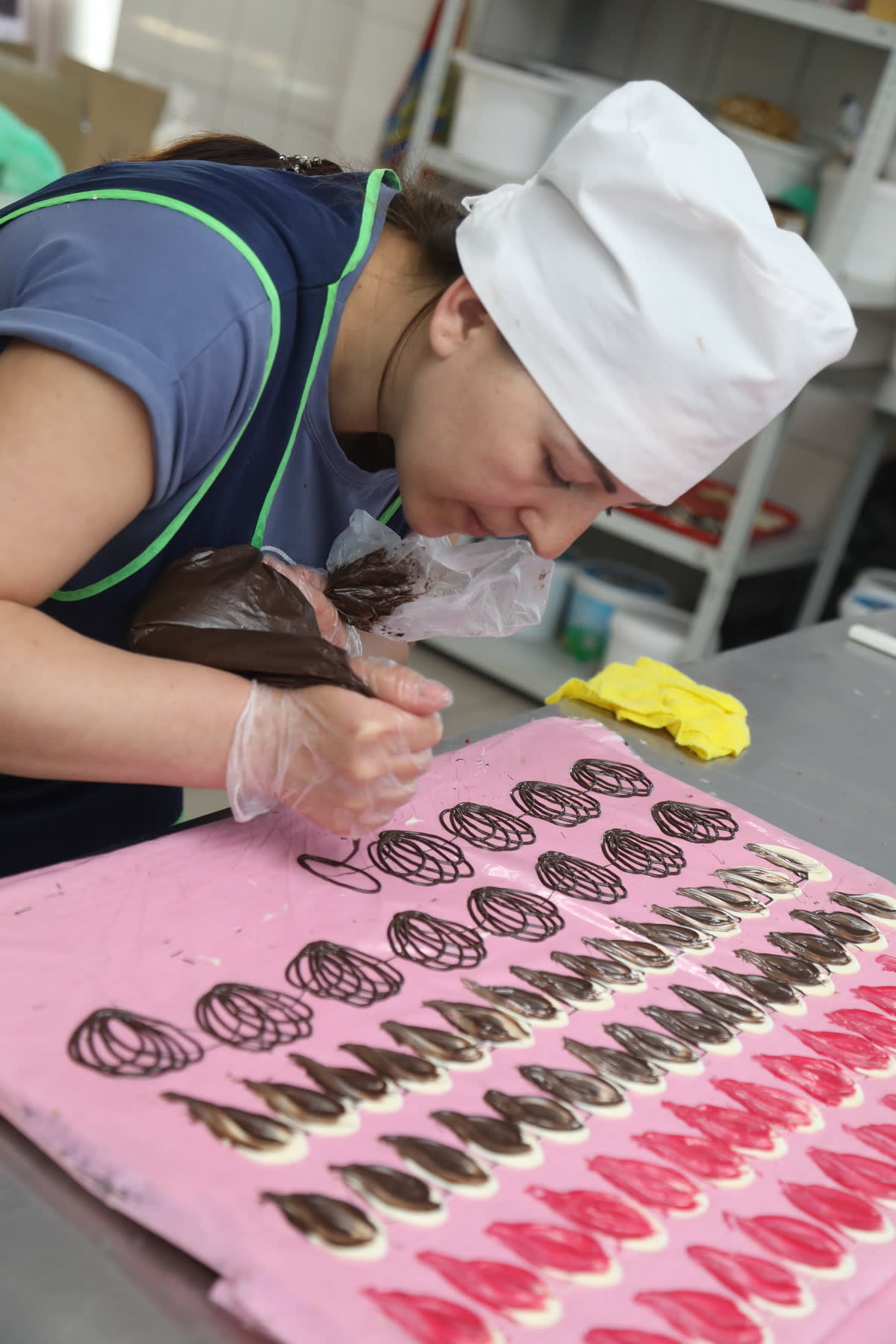 По соседству кондитер Римма Южакова привычно и сноровисто режет печенье и коржи. В кондитерском цехе пахнет праздником.
