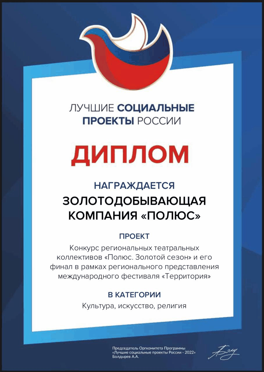 Конкурс региональных театральных коллективов «Полюс. Золотой сезон» и его финальные мероприятия – фестивали «Территория Иркутск» и «Территория Красноярск» стал лауреатом десятой юбилейной программы «Лучшие социальные проекты России». Высокой оценки экспертного жюри удостоена и корпоративная программа подготовки кадров для Исследовательского центра компании. Об этом 30 мая 2022 года сообщила пресс-служба компании.