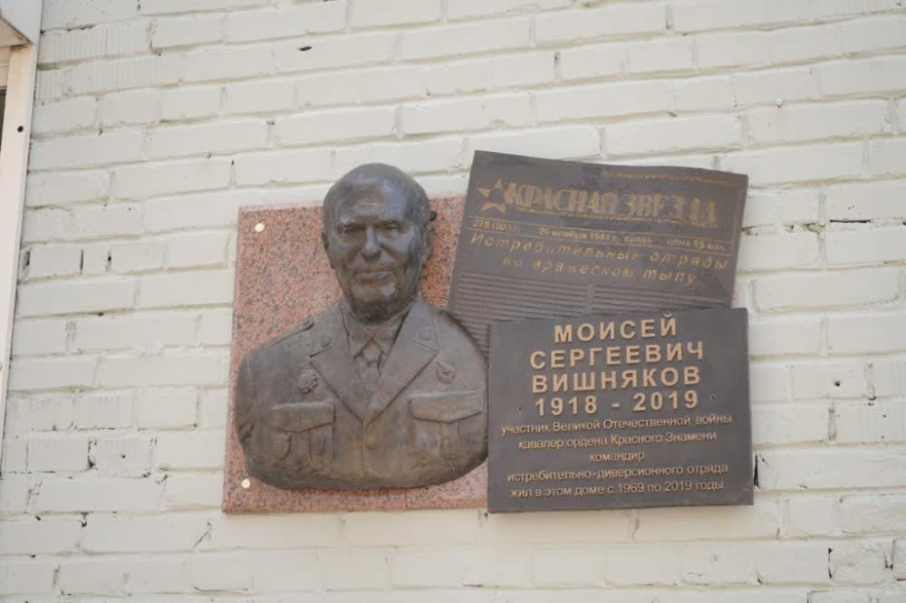 На доме № 90 по улице Лермонтова в Иркутске появилась мемориальная доска участнику Великой Отечественной войны, кавалеру ордена Красного Знамени полковнику Моисею Вишнякову. На памятном барельефе Моисей Сергеевич изображен на фоне семейной реликвии – газеты «Красная звезда», которая написала о подвиге фронтовика в далеком 1941 году.