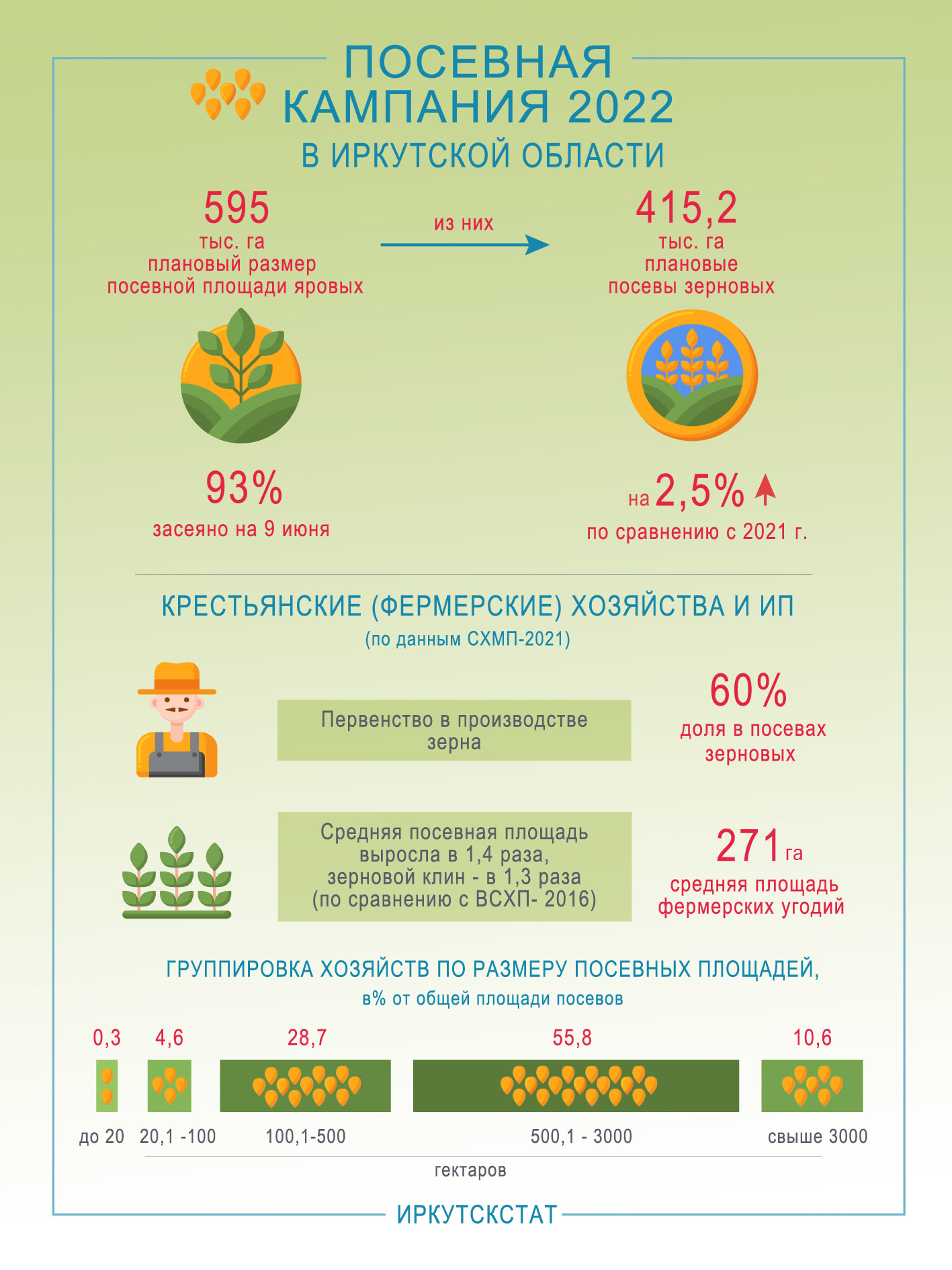 В Иркутской области близится к завершению посевная кампания – аграрии засеяли 93% из намеченных к посеву 595 тыс. гектаров. Об этом 9 июня 2022 года сообщает Иркутскстат.