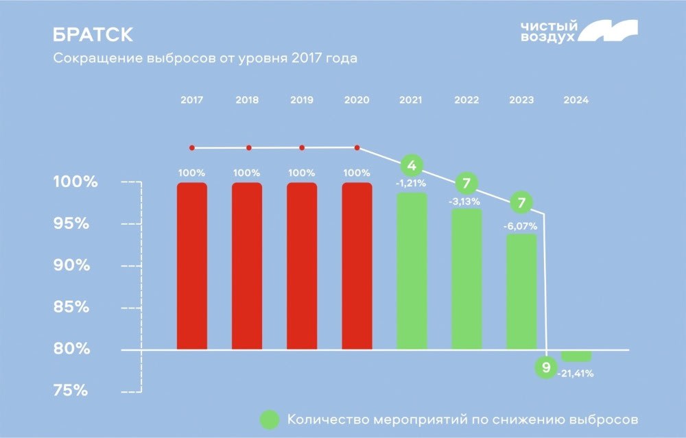 Министр подчеркнула, что во исполнение указа президента РФ по национальным целям и стратегическому развитию до 2024 года Братск вошел в федеральный проект «Чистый воздух». Был разработан комплексный план мероприятий, реализация которых позволит снизить уровень загрязнения атмосферного воздуха в городе с очень высокого до повышенного. Кроме того, сформирован перечень приоритетных загрязняющих веществ, оказывающих наибольшее негативное воздействие на окружающую среду и здоровье человека.