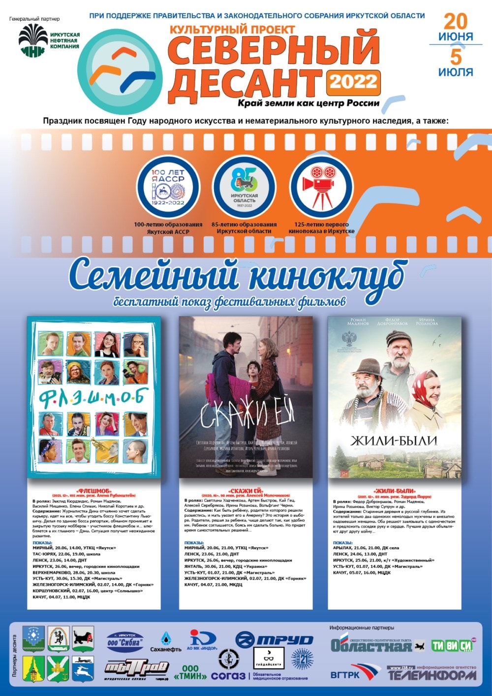 «Северный десант» посвящен еще одной дате, крайне важной для развития общества, человечества, считает Татьяна Жиндаева, – это 125-летию первого показа кино в Прибайкалье: «В Иркутске изобретение братьев Люмьер появилось спустя всего два года. И это исторический факт, который малоизвестен даже иркутянам. Вместе с Юрием Яшниковым, руководителем Центра развития кинематографии им. Леонида Гайдая, мы решили воспользоваться возможностями проекта и провести несколько встреч, чтобы рассказать об истории местного кино. А она, к слову, богата, интересна и успешна, в том числе современная». Будут представлены работы иркутских кинематографистов: «Верить и мечтать», «Высоцкий в Иркутске» и «Подарок».