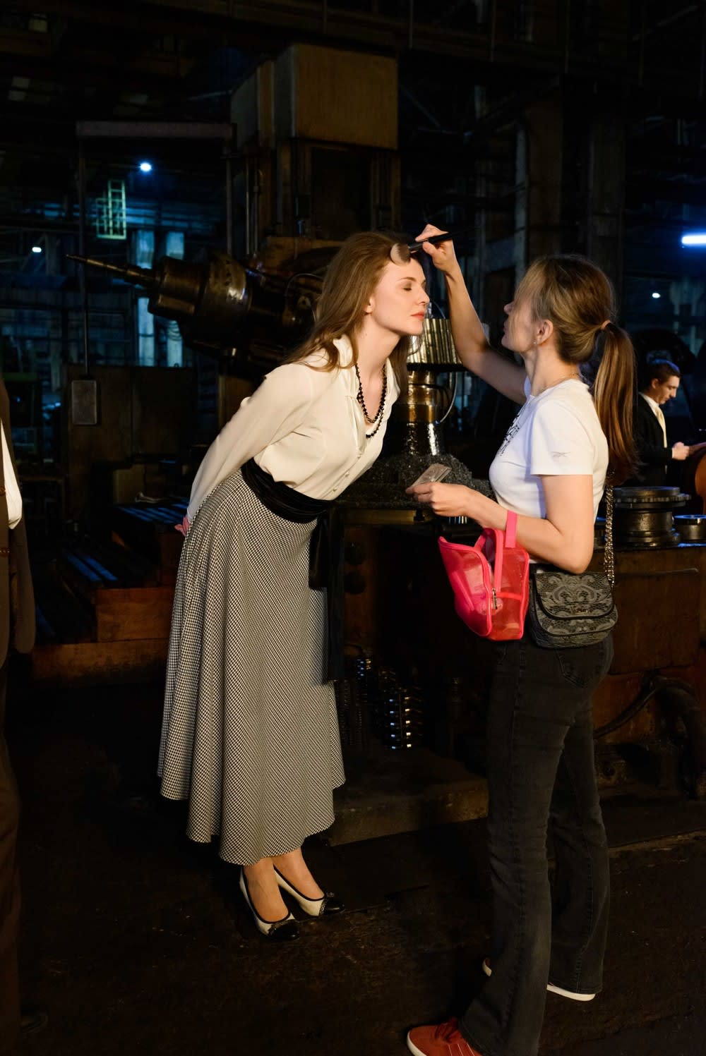 – Концепция фильма: театр на заводе, поэтому у нас не было задачи сделать все точно в плане исторических предметов, – рассказала Анастасия Зверькова. – Например, в сценарии был газовый фонарь XIX века, который нужно было зажечь с помощью спички. Мы долго не могли найти такой, в итоге взяли более современный, отреставрировали, сделали ему дверцу и керосиновую основу. А на заводе для него изготовили основание из деталей для горнодобывающего оборудования, чтобы он мог стоять на земле.