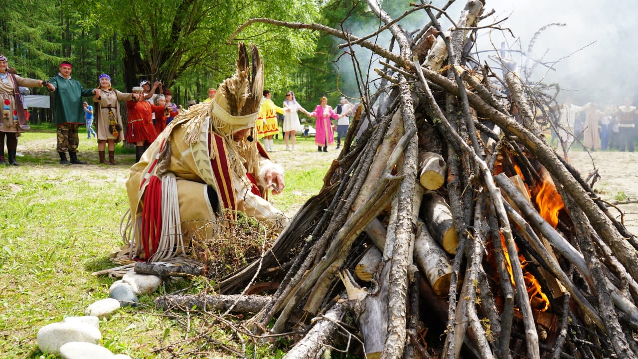 Участники фестиваля завязывали цветные ленточки на дереве, загадывая желание, жгли костер. О благополучии присутствующих помолился местный шаман. Чтобы задобрить духов, он провел ритуал очищения.