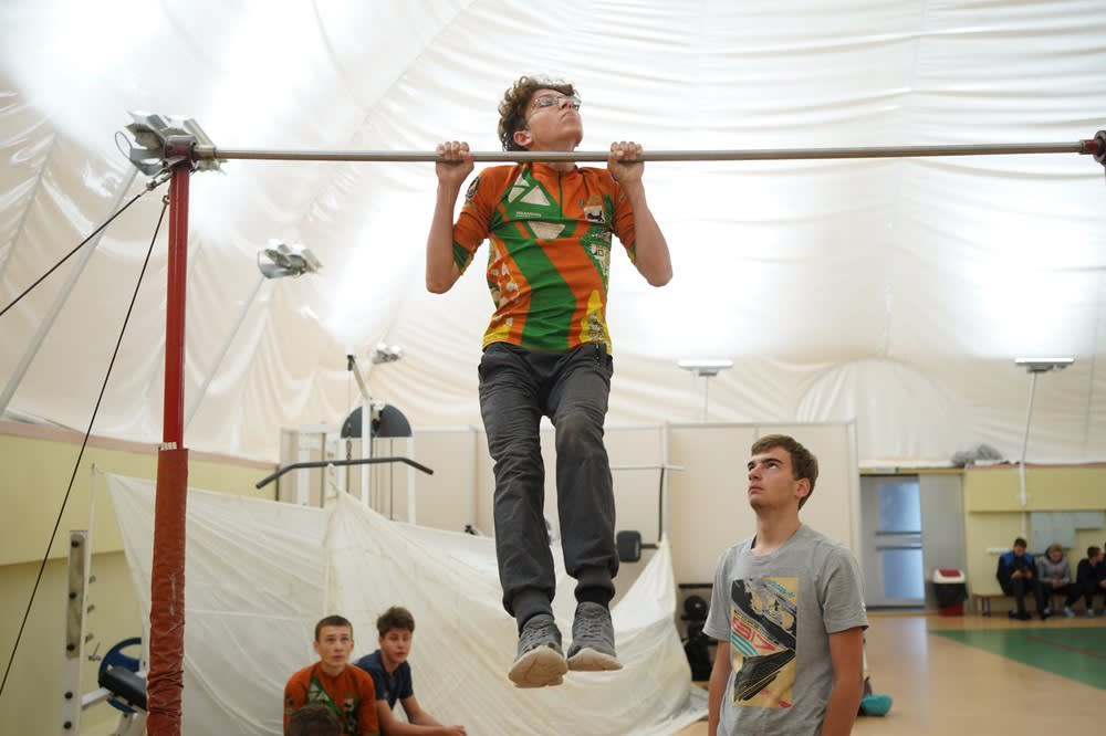 – Старайся отжиматься повыше! – советует своему подопечному Роман Сорокин, подсаживая мальчишку на турник.