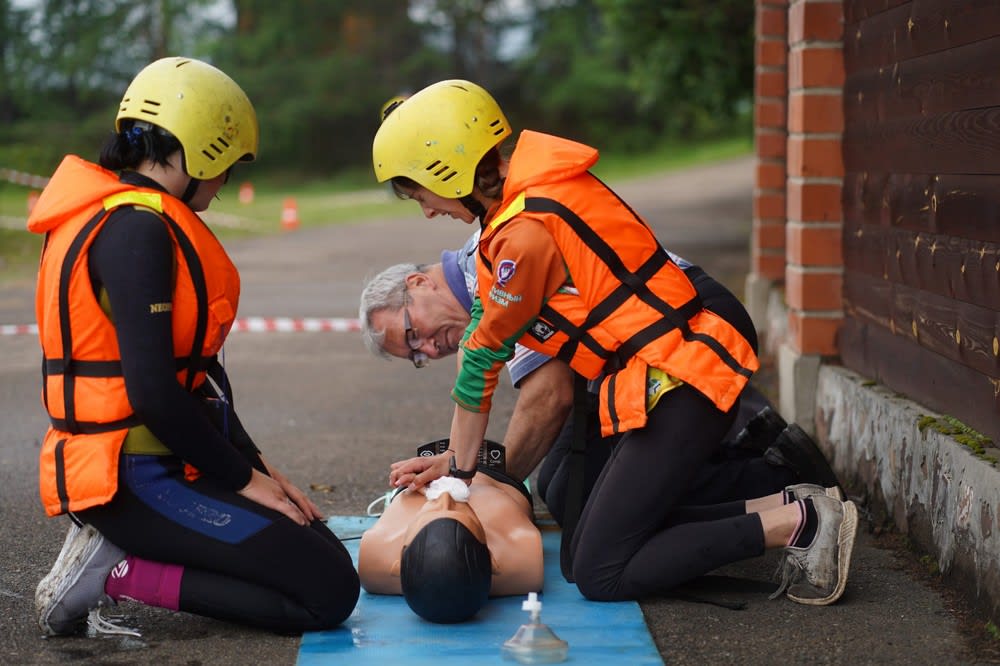 – Сначала команда должна пройти «ворота» и вешки «змейкой», не коснувшись буев, – раскрывают детали этапа судьи. – Одного пострадавшего, роль которого выполняет человек, они должны вытащить из воды при помощи спасательного круга, другого – манекена – снять со «льдины». Далее – двигаться задним ходом, чтобы опять пройти «ворота». На берегу на специальном манекене им нужно сделать искусственное дыхание и непрямой массаж сердца, а после, когда у «утопающего» появился пульс, снова пересесть на катамараны. Один из катамаранов нужно в воде специально перевернуть, поставить его обратно и плыть дальше…