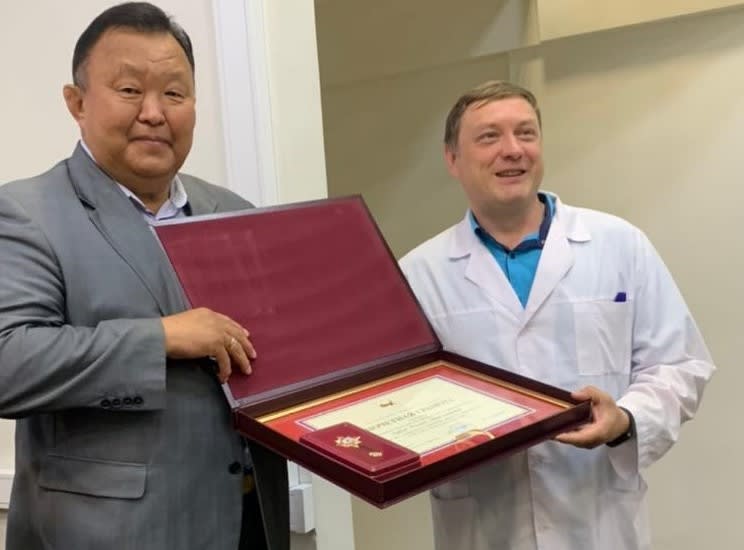 Вице-спикер ЗС Кузьма Алдаров вручил почетную грамоту заведующей кардиологическим отделением Иркутской городской клинической больницы № 3 Русине Ягудиной.