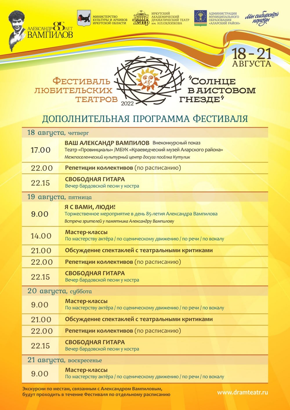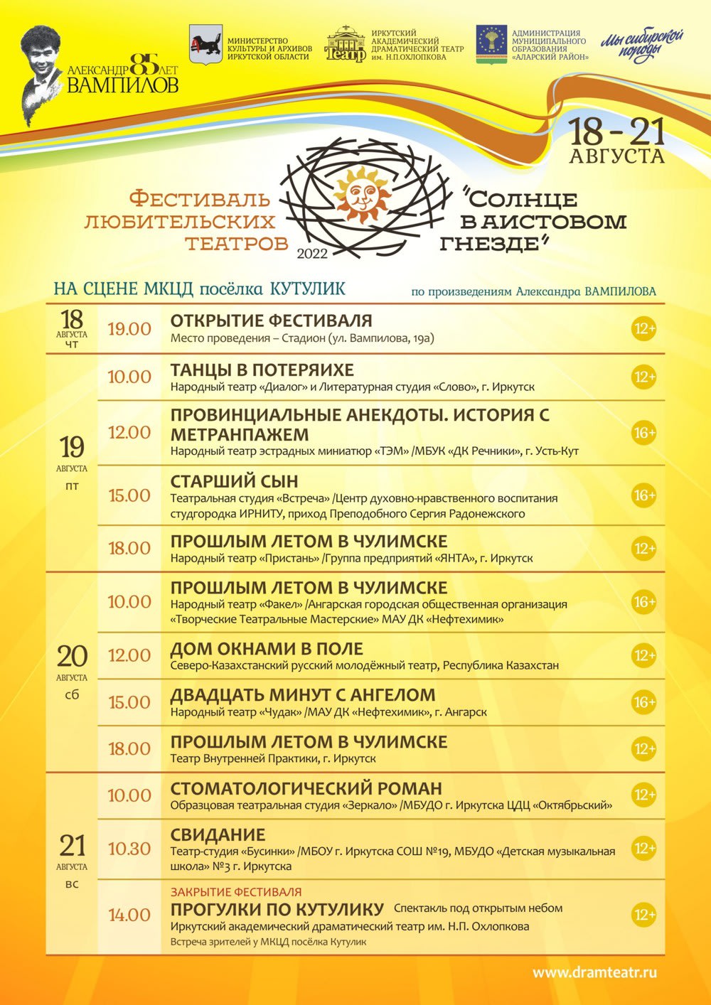 Фестиваль любительских театров «Солнце в аистовом гнезде» откроется 18 августа на родине Александра Вампилова – в посёлке Кутулике. Он посвящён 85-летию сибирского драматурга. На открытии выступят творческие коллективы Аларского района, также запланировано торжественное шествие театров. Об этом 12 августа 2022 года сообщила пресс-служба правительства Иркутской области.