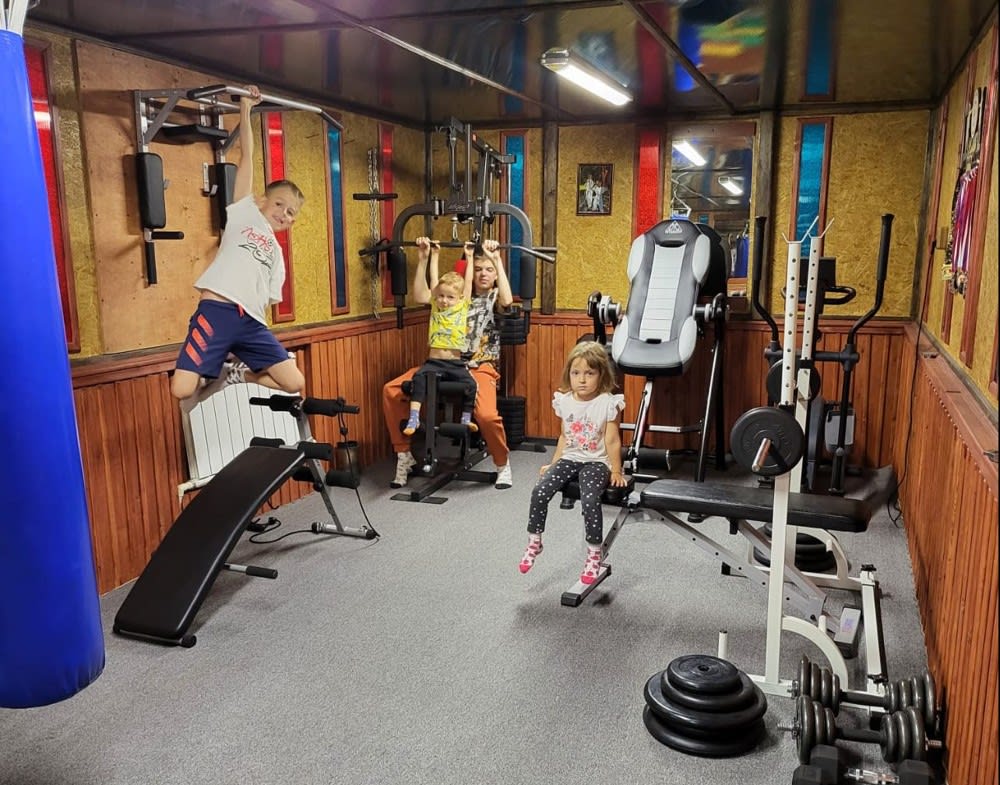 Для своей семьи папа придумал необычный проект дома: в цоколе, кроме бойлера и хозпомещений, обустроил настоящий спортивный зал с тренажерами, матами, турниками. На втором этаже разместил гостиную с кухней, между этажами – спальню, а весь третий этаж сделал детским, где появилась большая игровая зона, оформленная в космическом стиле, и детские комнаты.